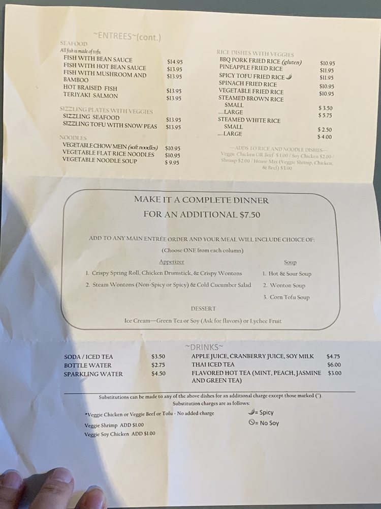 Vegetable noodle soup, comes with choice of appetizer: crispy or steamed wontons, drumstick, spring roll, cucumber salad. Select soup: hot & sour, wonton, corn tofu. Dessert: ice cream, lychee.